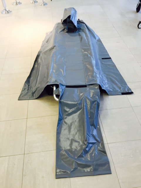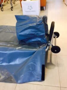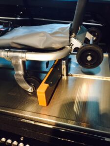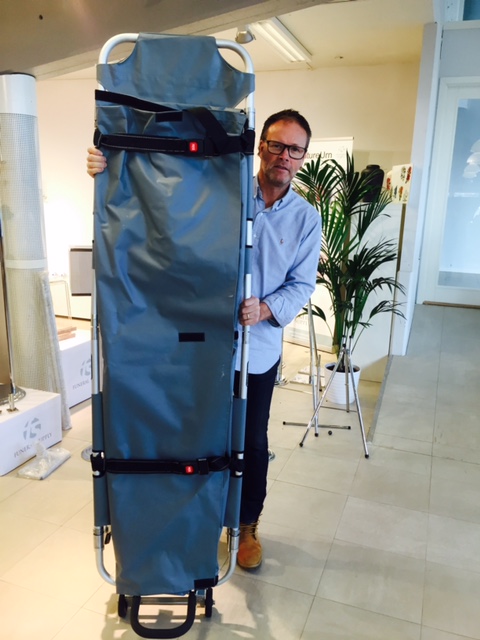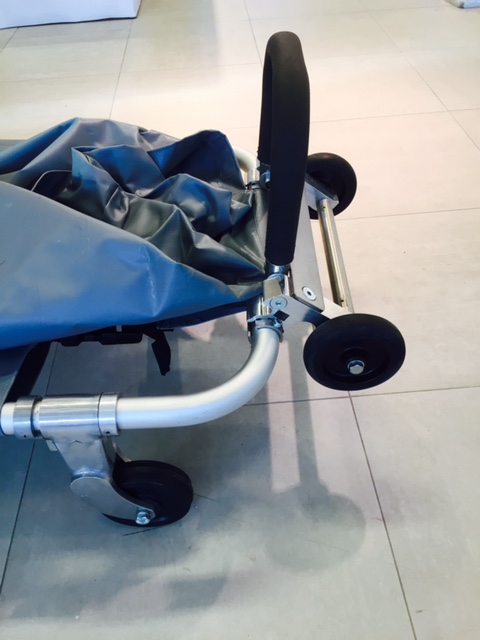 sammenleggbar båre fra Spencer, denne har et ekstra sett med hjul slik at den kan løftes opp i stående posisjon hvor neste hjulsett overtar.