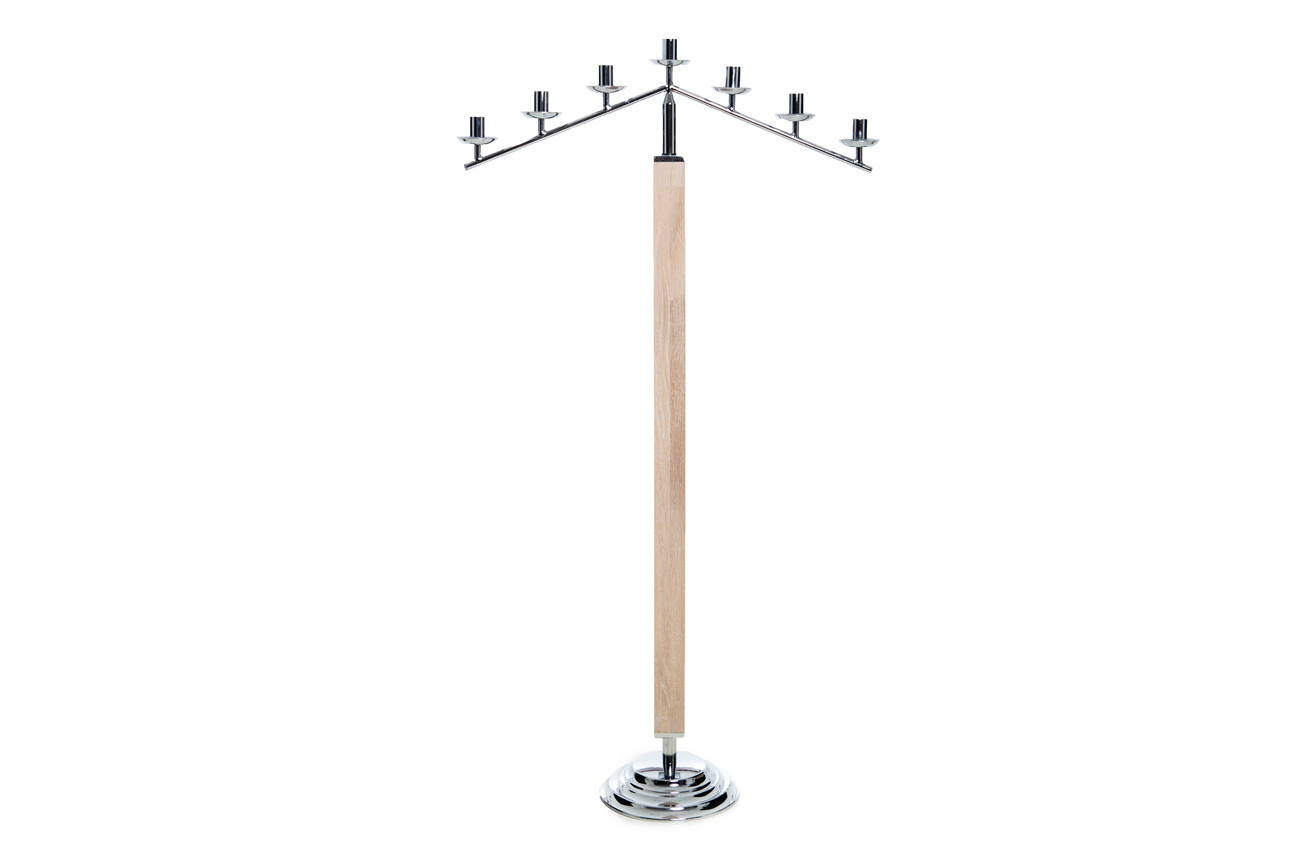 spiss lysestake for 7 krone lys, passer på valgfri sokkelhøyde i krom eller Eik