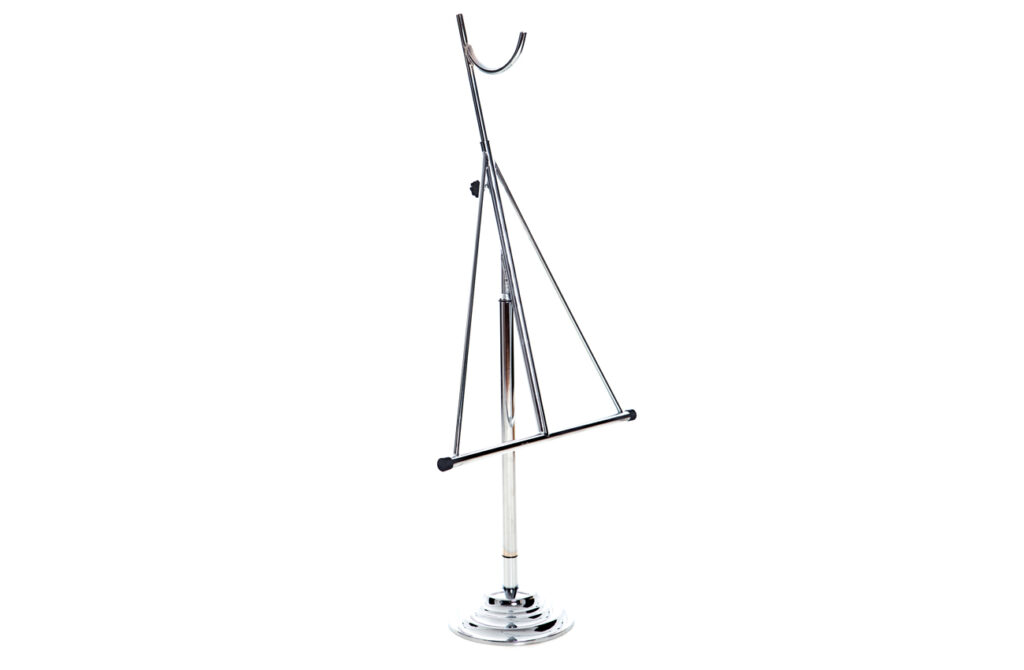 Gulvstativene med krok og bøyle kan ta av bakre bel av foten, kransestativene med 3 føtter kan slås sammen hvor bakre fot holdes fast med magnet.