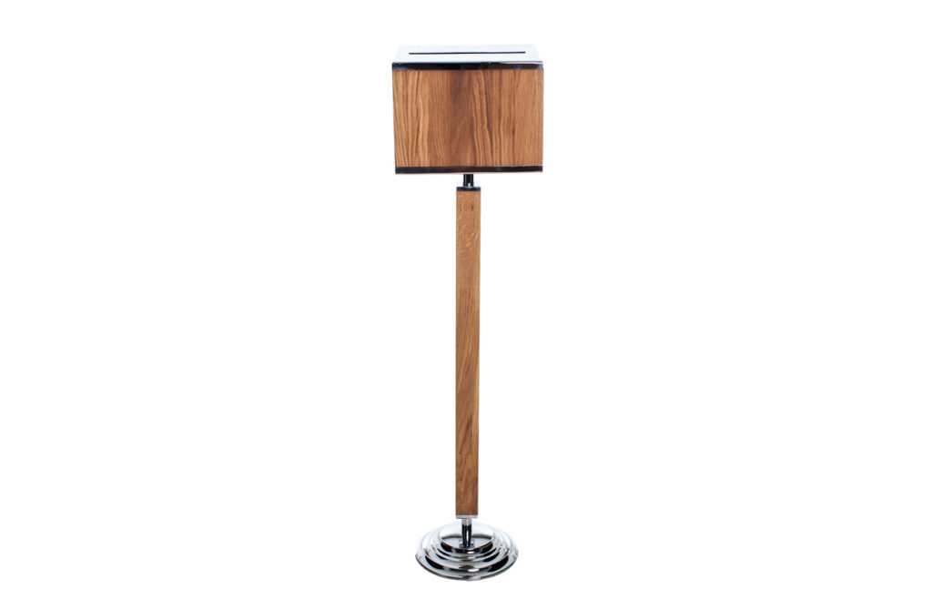 GAVEKASSE med topp og bunn i stål, sokkelhøyde i Eik og Krom