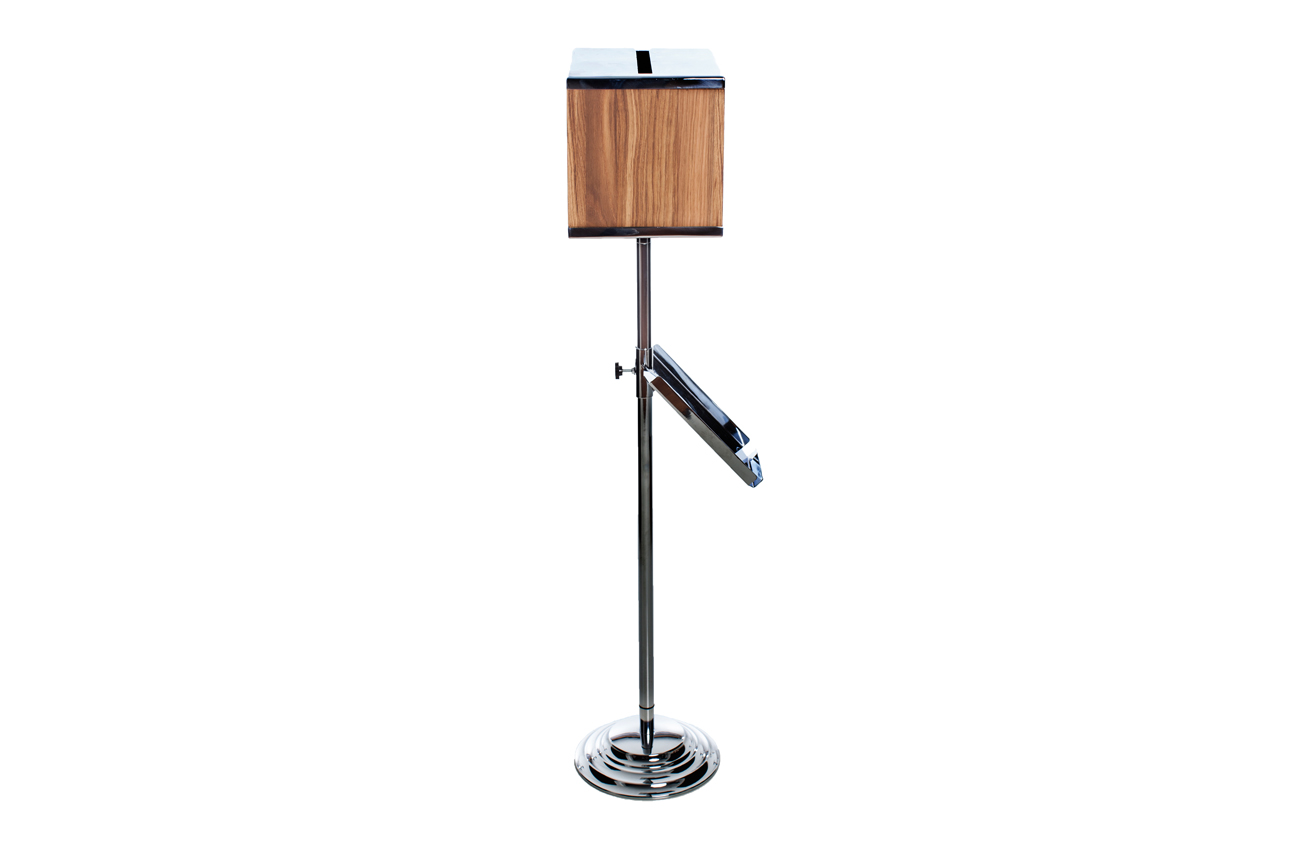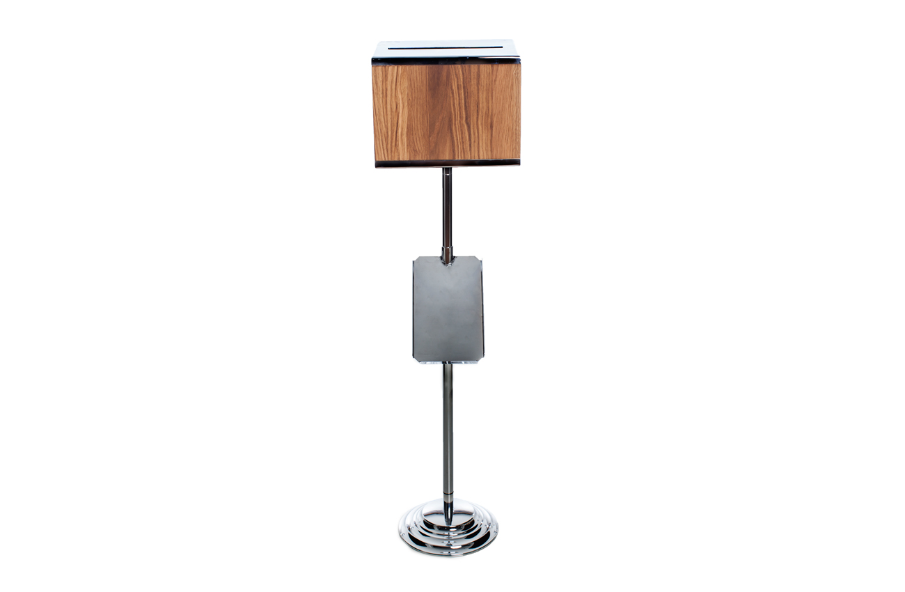 GAVEKASSE med topp og bunn i stål, sokkelhøyde i Eik og Krom